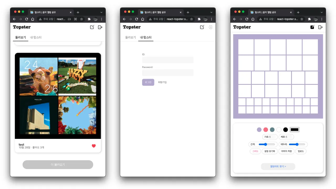 스파르타의 최대장점은 5주동안 강의를 듣고 다음 3주동안 개인 프로젝트를 진행한다는 것이다. 3주동안 개인 멘토를 붙여주는데, 운좋게 좋은 멘토분을 만나서 물어보고 싶은 것 다 여쭤볼 수 있는 좋은 기회였다. 같이 교육을 듣는 다른 사람들은 스파르타에서 배운대로 바닐라+jQuery와 Flask를 이용한 간단한 프로젝트로 마무리하는데, 난 군대에서부터 공부해왔던 리액트를 써보고 싶었다. 탑스터 이미지를 만들고 이미지를 공유하는 SNS 서비스를 구현했다. 개인 프로젝트로서 이정도 규모로 개발하는게 처음이었기 때문에 정말 좋은 경험이었다. 상태관리 구조때문에 많이 애먹고 고민을 할 수 있었다. 이벤트나 파일 등을 다루어보면서 자바스크립트에 대한 공부도 되었다. 웹디자인은 몇번 해보았지만, 실제 개발을 염두에 두고 작업한 디자인과 개발까지 했던 경험도 이후의 프로젝트에 큰 도움이 되었다. 강의는 모르겠지만 돈값은 내가 하기 나름인 것 같다.