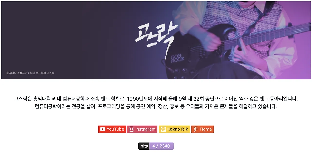 고스락에 들어오고부터 많은 애정을 쏟았다. 학생때부터 어딘가에 소속되어서 일하는게 취미였다. 공연도 매번 하고 디자인 개발도 하면서 거의 고스락 공무원처럼 지냈던 것 같음. 그렇게 새내기부터 지금까지 무언가를 계속 해온 결과가 꽤 있다. 카카오 채널과 유튜브를 새로 파서 운영하고 있다. 상상마당 공연 때 티켓 판매를 위해서 임시로 만들었던 채널은 지금 웹사이트를 통해 티켓 판매를 할 때도 요긴하게 잘 쓰고 있다. 신입생 모집은 소모임 기능과 온라인 웹페이지 홍보 등을 통해서 우리때보다 두 배 이상 많은 지원자를 모았다(웹사이트 덕분 맞겠지?? - 라고 마음대로 생각하는 중).
